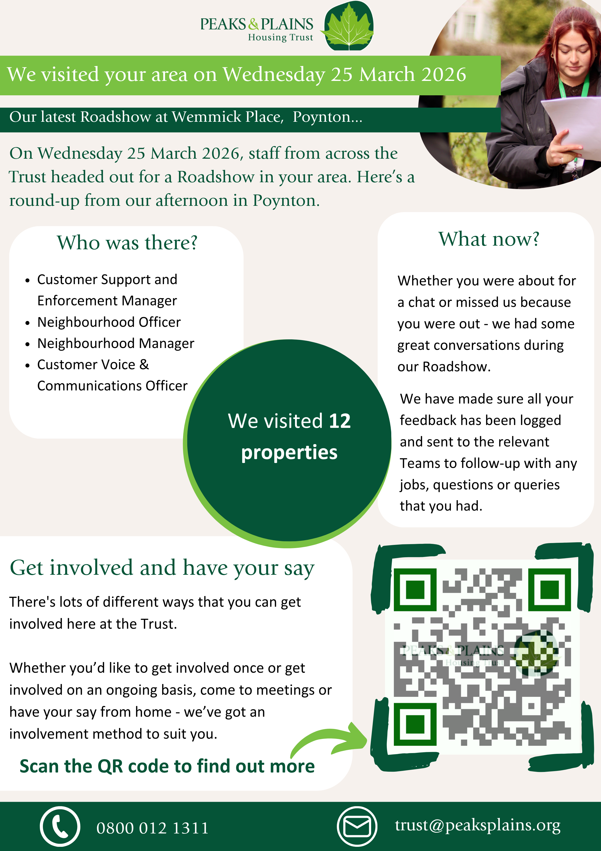 Roadshows see staff from across the Trust heading out to say hello. We knock on and check-in on how you are doing - giving you the chance to give us feedback or report any repairs or other issues.